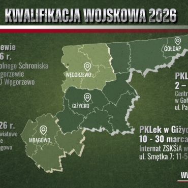 Kwalifikacja wojskowa na terenie całej Polski prowadzona będzie w terminie od 2 lutego do 30 kwietnia 2026 roku. Jest to postępowanie administracyjne, które nie oznacza powołania do wojska, lecz ma na celu określenie zdolności fizycznej i psychicznej obywateli do czynnej służby wojskowej oraz aktualizację ewidencji wojskowej. Na terenie powiatu mrągowskiego kwalifikacja wojskowa odbędzie się w dniach 8–23 kwietnia 2026 roku, w godzinach 7:00–14:00. Powiatowa Komisja Lekarska w Mrągowie będzie pracować […]